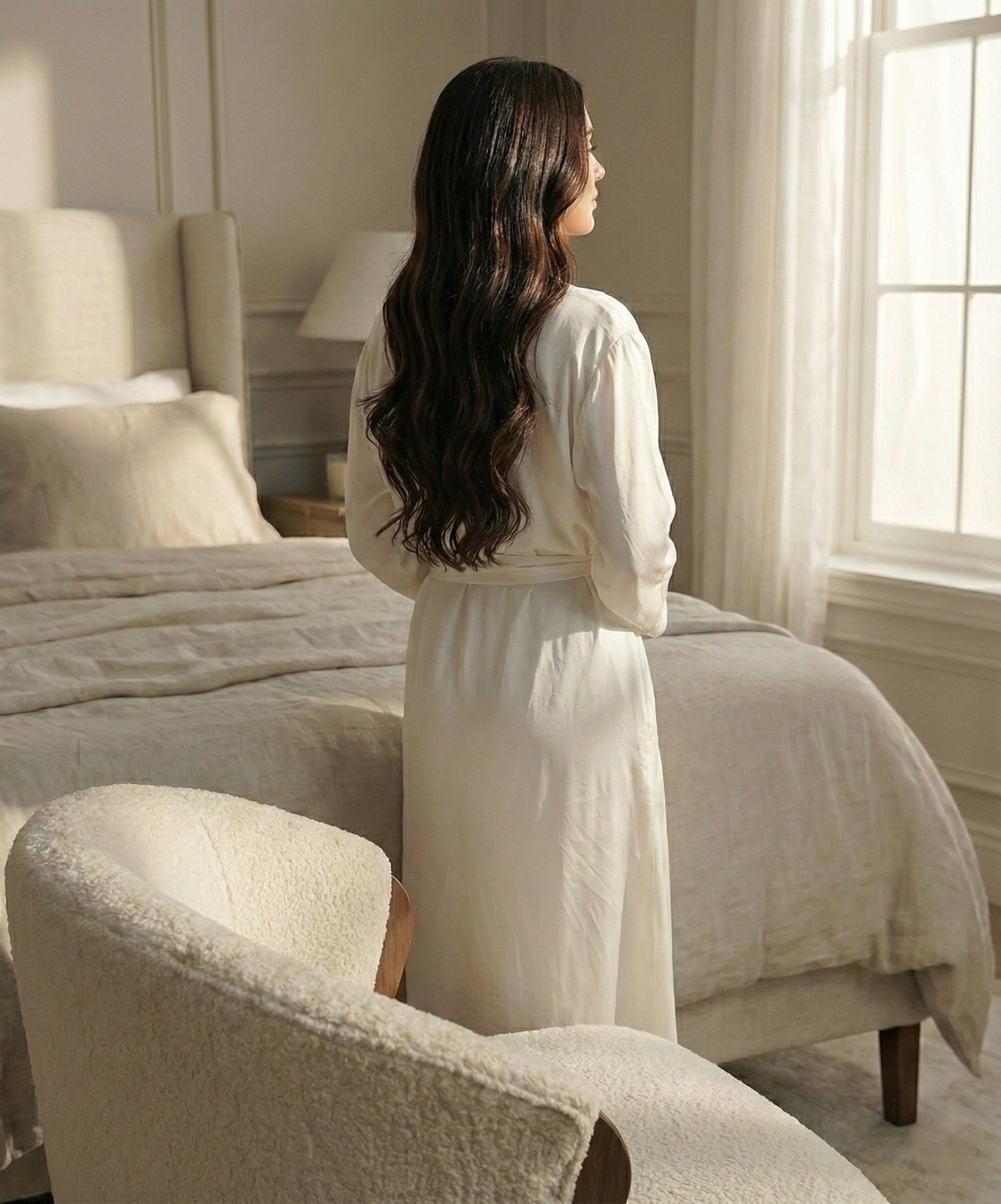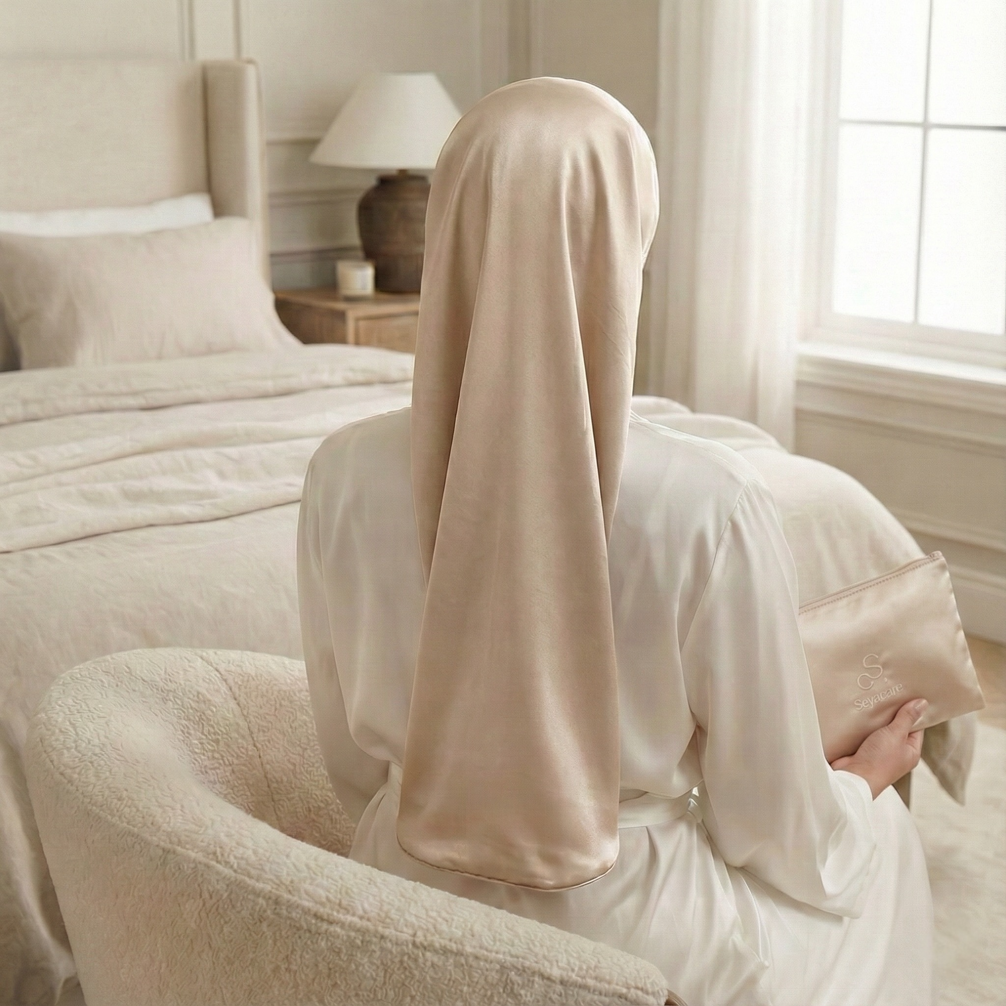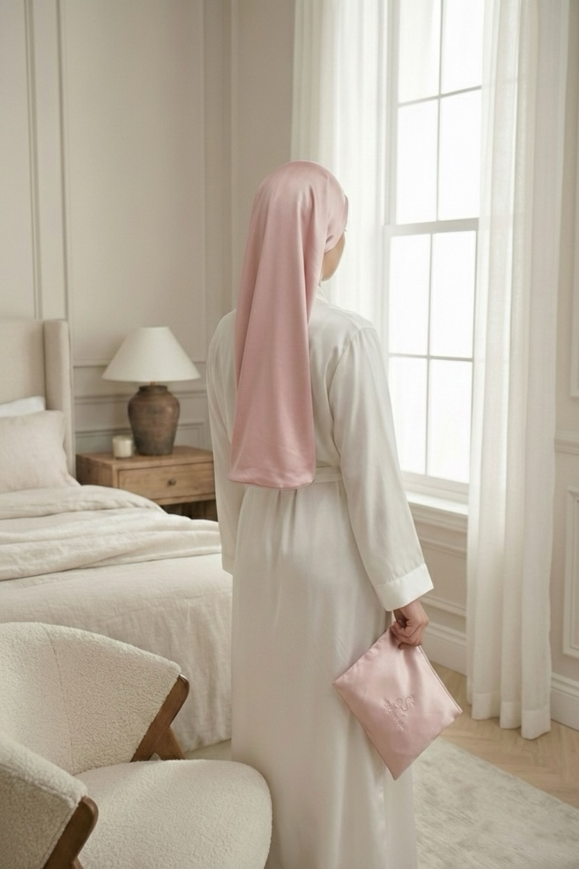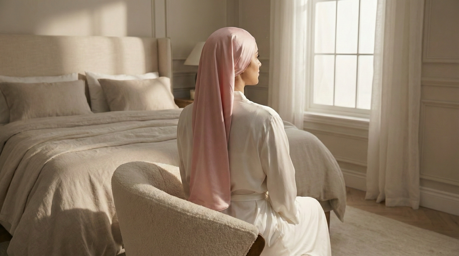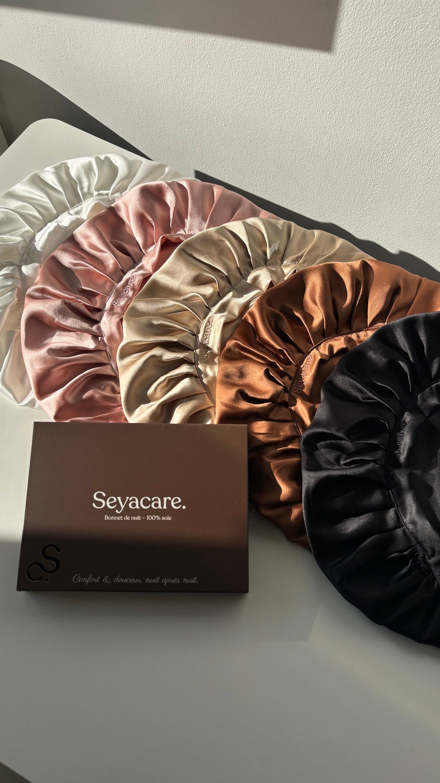 La soie est au cœur de cette vision : une matière noble, délicate, respectueuse des cheveux et de la peau, qui invite à ralentir et à prendre soin de soi avec douceur.